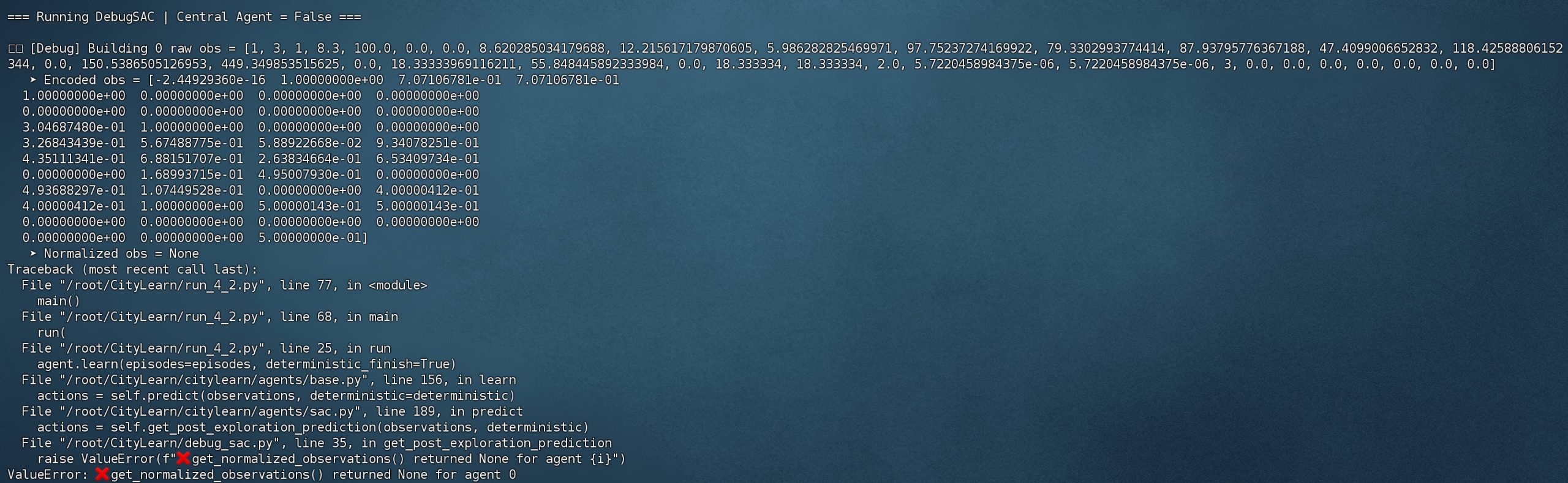 在 CityLearn + SAC 中,归一化之所以会出现 None 并报错,是因为强化学习里的智能体(agent)是通过与环境逐步交互来“学习观察数据的分布”,而不是像传统机器学习那样在一开始就加载所有数据并计算整体均值和标准差。归一化需要用到观测数据的均值和标准差(mean/std),但在训练初期,agent 还没有收集到足够的观测数据,这些归一化参数尚未建立,因此 get_normalized_observations() 返回了 None。也就是说,错误并不是由原始数据或环境造成的,而是因为“agent 还不了解环境的数据分布,却提前尝试对整个环境进行归一化”。解决方法可以是跳过归一化、在训练前进行 warm-up 收集数据以初始化均值和标准差,或使用 centralized agent 等方式。